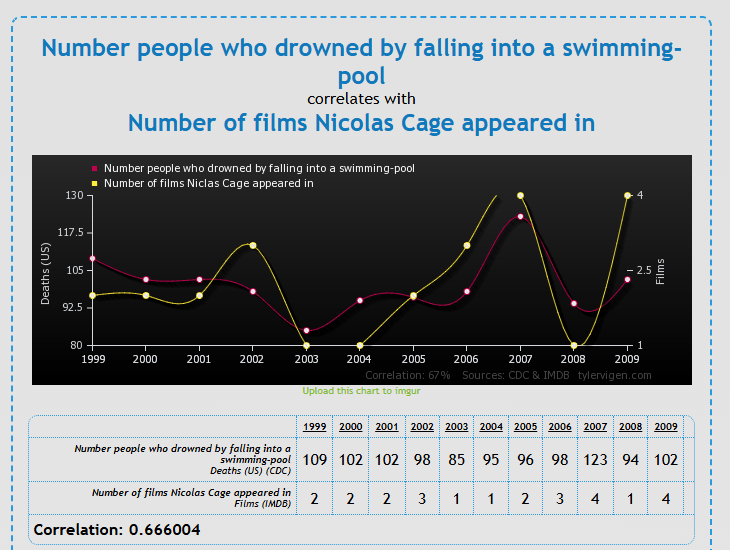 Cet autre graphique montre de 1999 à 2009 en rouge le nombre de personnes aux USA qui sont mortes en se noyant dans une piscine après être tombés dedans. Et en jaune, le nombre de films ou l’acteur Nicolas Cage fait une apparition.