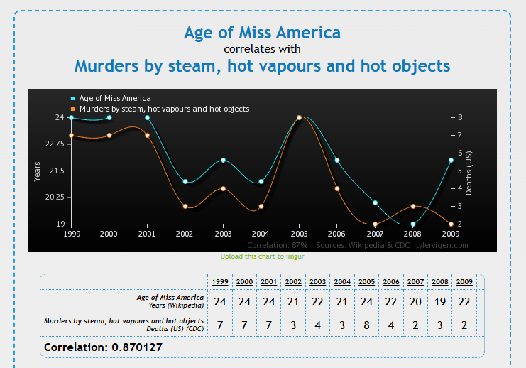 Ce premier graphique montre de 1999 à 2009 en bleu l’âge de miss America. Et en orange, le nombre de meurtres aux USA par objets chauds, contenant de la vapeur chaude, ou par vapeur tout court.